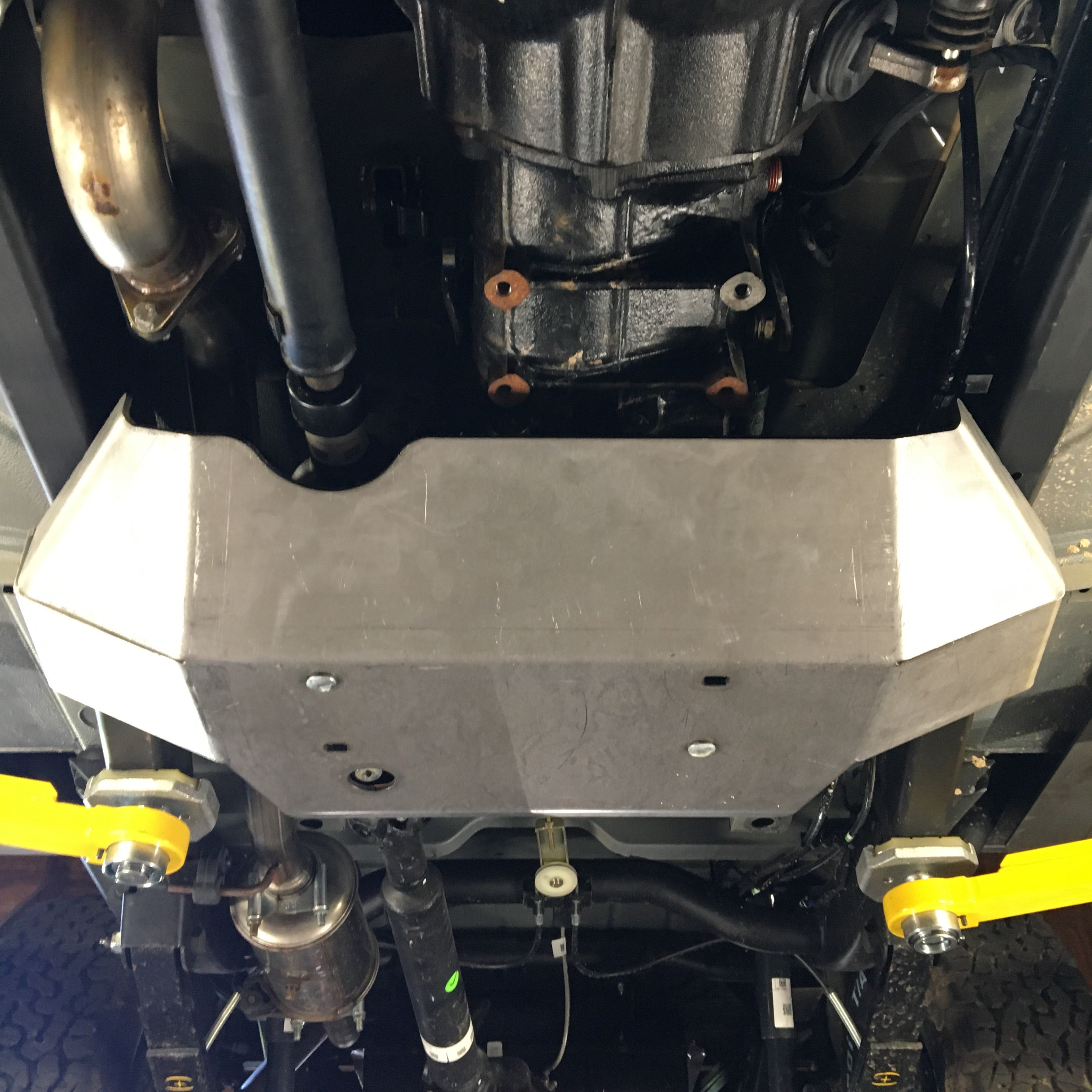 - Remove the (4) factory skid plate bolts and install the new HD skid plate using existing factory skid plate bolts & location
